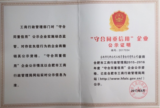 近日,合肥市工商行政管理局頒發(fā)了市級守合同重信用公示證書,合肥市天秤水利工程質(zhì)量檢測有限公司首次申報并獲得此項殊榮。 天秤公司在發(fā)展過程中一直注重于提升企業(yè)的社會影響力,日益健全合同信用管理體系,完善并規(guī)范...