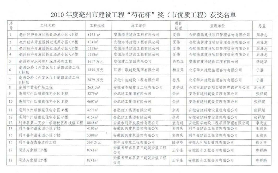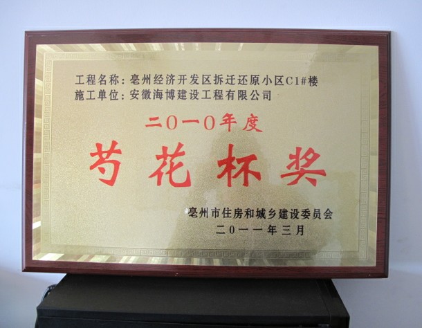 熱烈祝賀由安徽海博建設(shè)工程有限公司亳州項(xiàng)目部承建的亳州經(jīng)濟(jì)開(kāi)發(fā)區(qū)拆遷還原小區(qū)C1#、C2#、C3#、C5#號(hào)樓四個(gè)單位工程榮獲2010年度亳州市優(yōu)質(zhì)工程“芍花杯”獎(jiǎng)。