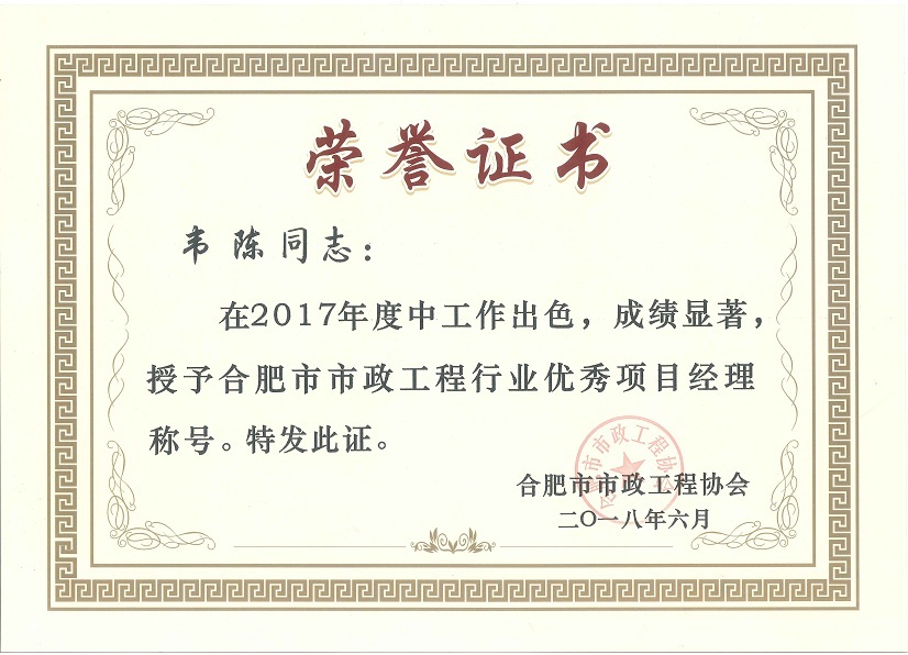 近日,安徽省市政工程協(xié)會發(fā)布了市政協(xié)會秘字【2018】06號文件,文件中表彰了2017年度“安徽省優(yōu)秀市政施工企業(yè)”和“安徽省市政施工企業(yè)優(yōu)秀建造師(項目經(jīng)理)”。經(jīng)過省市政工程協(xié)會專家評審委員會的層層評比,我司榮獲2017年度“安徽省優(yōu)秀市政施工企業(yè)”稱號,公司馬新余、周宗兵、趙行東三位同志被授予“安徽省市政施工企業(yè)優(yōu)秀建造師(項目經(jīng)理)”稱號。